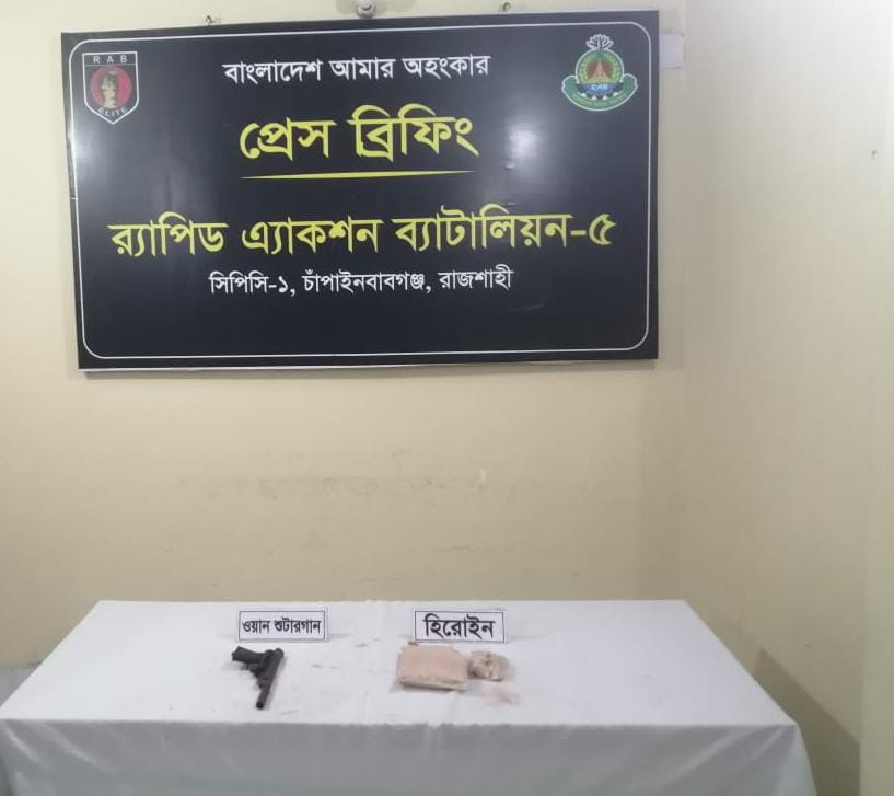 র্যাপিড এ্যাকশন ব্যাটালিয়ন (র্যাব) ১৮ সেপ্টেম্বর ২০২৪ ইং তারিখ ২১:৩০ ঘটিকায় সিপিসি-১, চাঁপাইনবাবগঞ্জ, র্যাব-৫, রাজশাহী এবং সেনাবাহিনীর একটি আভিযানিক দল গোয়েন্দা তথ্যের ভিত্তিতে সদর থানাধীন চাঁপাইনবাবগঞ্জ জেলার সদর থানাধীন চাঁপাইনবাবগঞ্জ পৌরসভার ১৩নং ওয়ার্ডের অর্ন্তগত রেহাইচর গ্রামস্থ মহানন্দা সেতুর পশ্চিম পাড় সংলগ্ন সড়ক ও সেতু ভবনের উত্তর পার্শ্বে মহানন্দা নদীর পাড়ে অভিযান পরিচালনা করে পরিত্যক্ত অবস্থায় ৫৯০ গ্রাম হেরোইন এবং একটি ওয়ান শুটারগান উদ্ধার করে। গোয়েন্দা তথ্যের ভিত্তিতে জানা যায় যে, চাঁপাইনবাবগঞ্জ সীমান্তবর্তী এলাকা হতে মাদক সংগ্রহ করে চাঁপাইনবাবগঞ্জ শহরের দিকে প্রবেশ করবে। সংবাদ পাওয়ার পর আভিযানিক দল পূর্ব পরিকল্পনা মোতাবেক উক্ত এলাকায় গমন পূর্বক মাদকের সম্ভাব্য রুট সমূহের উপর নজরদারী বৃদ্ধি করতে থাকে। এমতাবস্থায় মাদক কারবারী মাদক এবং অস্ত্র বহনের সময় টহল দলের উপস্থিতি টের পেলে তাদের হেফাজতে থাকা আলামত ফেলে দিয়ে দৌড়ে পালিয়ে যায়। উপরোক্ত ঘটনায় উদ্ধারকৃত আলামত সমূহ চাঁপাইনবাবগঞ্জ জেলার সদর থানায় জিডি মূলে হস্তান্তর করা হয়েছে।