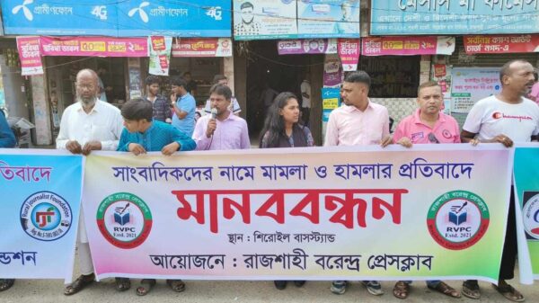 মোঃ মনোয়ার হোসেন, রাজশাহী সারা দেশের ন্যায় রাজশাহীতেও সাংবাদিকের উপর হামলা ও মামলার প্রতিবাদে মানববন্ধনের আয়োজন করা হয়। রাজশাহী বরেন্দ্র প্রেসক্লাব আয়োজিত বিভিন্ন সাংবাদিক সংগঠনের ব্যানারে গণমাধ্যম কর্মীরা উক্ত মানববন্ধনে