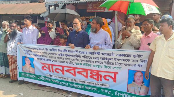 মাহিদুল ইসলাম ফরহাদ চাঁপাইনবাবগঞ্জ জেলা প্রতিনিধি চাঁপাইনবাবগঞ্জ সদর উপজেলার দেবীনগর ইউনিয়নের ধুলাউড়ি হাটে গুম হওয়া আরিফ কে ফিরে পেতে মানববন্ধন করেছে পরিবারসহ এলাকাবাসী।বৃহস্পতিবার সকাল সাড়ে ৯ টায় গুম হওয়া আরিফুল